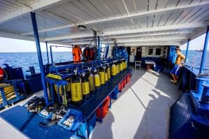 Three compressors of 39,000 liters per hour ensures a quick fill for your cylinders. There are thirty steel cylinders on board (a variety of 12 and 15 litres) fitted with H-valves, A-clamp/DIN fitting adaptors. Plenty of lead weights are available on board. Rental equipment is also available.